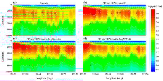 Figure 10 illustrates the retrieved underground resistivity structure profiles along the survey line from Occam (Figure 10a), PISwinTUNet-smooth (Figure 10b), and PISwinTUNets trained on AugGaussian (Figure 10c) and AugMWSG (Figure 10d), respectively. Evidently, the four methods produced quite compatible inversion results. The retrieved resistivity structures all show a pattern of low–high–low resistivity with increasing depth and can be characterized as follows: within the depth of 1500 m, it tends to be a uniformly layered conductive model; the deeper zones beneath 1500 m become intricate in their resistivity structure; and the high-resistivity anomaly is predominantly found between the depths of 1500 and 5000 m. These features align with the results from the phase tensor analysis, supporting the credibility of our inversions. By comparison, PISwinTUNet coupled with AugMWSG delivered results more comparable with Occam than PISwinTUNet-smooth and PISwinTUNet trained on AugGaussian. It can be observed that the latter two methods overestimated the resistivity values in localized highly resistive zones.