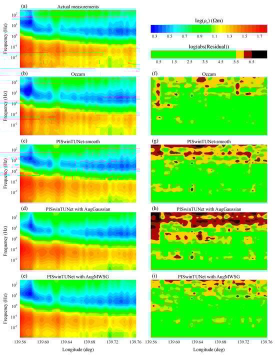 Comparison results of actual MT measurements and simulated MT responses. (a–e) display the actual apparent resistivity and the simulated apparent resistivity from the retrieved resistivity models of Occam, PISwinTUNet-smooth, PISwinTUNet trained on AugGaussian and PISwinTUNet trained on AugMWSG, respectively. (f–i) present the corresponding residual maps.