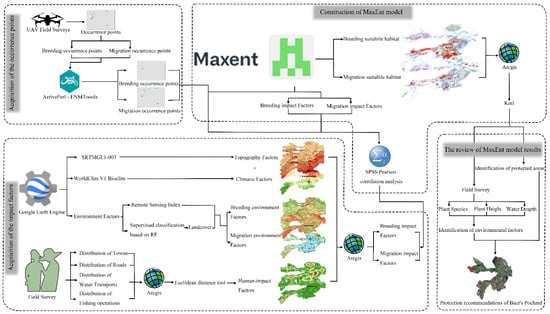 Our study is structured into three distinct stages: the acquisition of Baer’s Pochard occurrence data and relevant impact factors, the construction of the MaxEnt model, and the review of model results for the identification of protected areas (Figure 3).