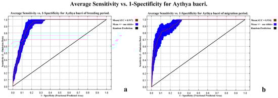 AUC curves for modeling habitat suitability of Baer’s Pochard: (a) is the AUC curves for Baer’s Pochard of breeding period; (b) is the AUC curves for Baer’s Pochard of migration period. The red (test) line represents the average fit of the model to the training data. The blue area represents the standard deviation of the fit of the model to the test data.
