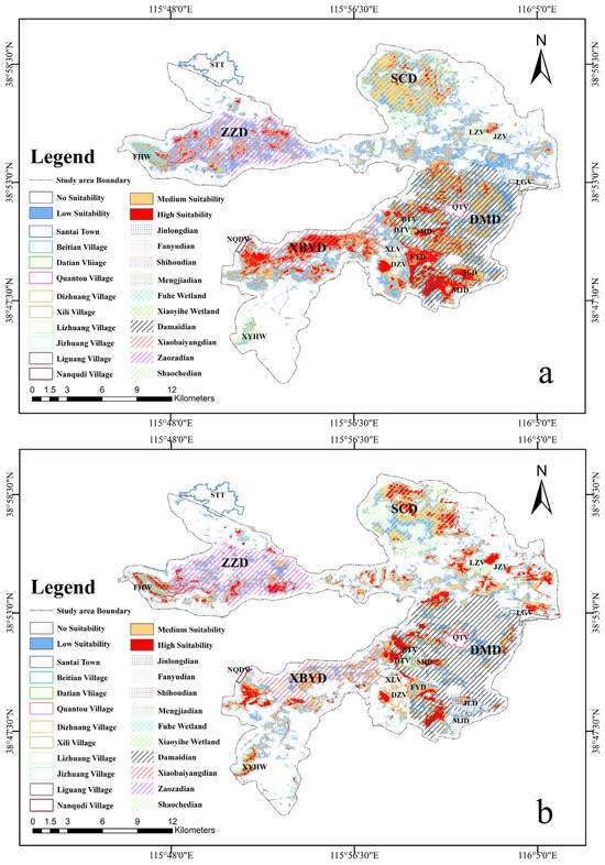 For the breeding season, the total suitable habitat area spans 162.39 km2. Additionally, the area of low-suitability habitat is 65.35 km2, the moderate-suitability habitat covers an area of 69.12 km2, and the high-suitability habitat occupies 27.92 km2 (Table S1). In terms of spatial distribution, the high-suitability breeding habitat primarily spans the regions of XBYD, Jinlongdian (JLD), Mengjiadian (MJD), Shihoudian (SHD), Fanyudian (FYD), west of Dizhuang Village (DZV), west of DTV, and north of BTV. The moderate-suitability habitat is mainly distributed on the SCD, along the shores of northern and western parts of the central region within the lake, as well as the east of DMD and the northeast and northwest sides of Quantou Village (QTV). The low-suitability habitat is extensively distributed across ZZD, the south of XBYD, and the north of DMD, while also being scattered throughout the southeast of Santai Town (STT), east and west sides of the Baiyangdian Grand Bridge, east of Jizhuang Village (JZV), west and south of Lizhuang Village (LZV), and north of Liguang Village (LGV) (Figure 5a).
