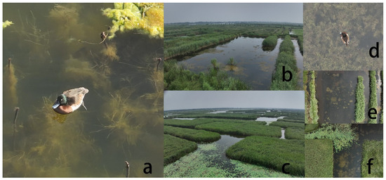 Photographs of Baer’s Pochard species and habitats: (a) shows a species photograph of the Baer’s Pochard; (b,c,e,f) are aerial photographs of the distributional habitats of Baer’s Pochard and the corresponding aerial orthophotos at an altitude of 50 m; and (d) shows the Potamogeton crispus that Baer’s Pochard feeds on.