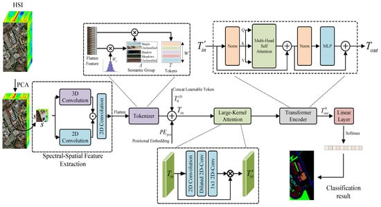 This paper introduces an innovative network that enhances the understanding of image data within the Transformer model and improves its robustness. We have enhanced the module for extracting Spectral–Spatial Shallow Features and integrated it with a Transformer architecture featuring a Large-Kernel Attention module to thoroughly extract spatial and spectral information from HSIs. During the phase of extracting Spectral–Spatial Shallow Features, We adopted a dual-branch structure, with the first branch extracting spectral–spatial features from HSI and the second branch extracting spatial features. To further enhance the quality of extracted features, strengthen the Transformer’s comprehension of image data, alleviate the computational complexity of attention mechanisms, and effectively mitigate the impact of redundant information, we designed a Large-Kernel Attention Module preceding the Transformer encoder. This enhancement aims to reduce redundancy and elevate the overall performance of the model.