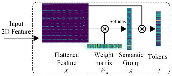 In the formula, represents element-wise multiplication with dimensions , and represents a weight matrix. We initialize this weight matrix using a Gaussian distribution. At this stage, the newly generated semantic groups are represented by . Next, is transposed. We apply the softmax function () to the transposed result to emphasize important semantic components. Finally, the multiplication of and generates the module’s final output semantic tokens . The specific process is visualized in Figure 2.