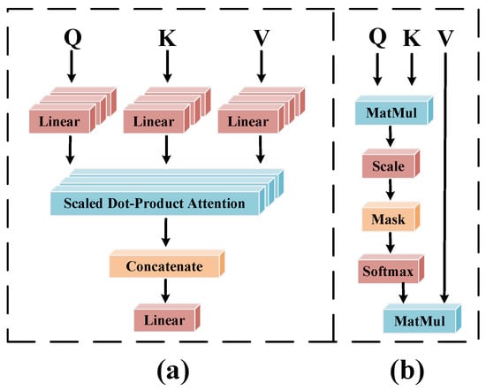 Visual representations of (a) Multi-Head Self-Attention Module and (b) self-attention in the Transformer architecture.