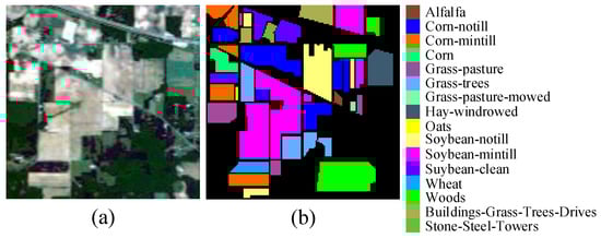 Indian Pines dataset: This dataset was acquired in northwestern Indiana, USA, in 1992, using the Airborne Visible/Infrared Imaging Spectrometer (AVIRIS) sensor. The HSI consists of 224 bands with a wavelength range from 0.4 to 2.5 micrometers. The image comprises 145 × 145 pixels with a spatial resolution of 20 m and includes 16 land cover categories. In our experiments, a total of 200 bands were chosen (excluding water-absorbing and noisy bands). Pseudo-color images and ground-truth maps are illustrated in Figure 4a and b, respectively.