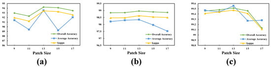The impact of different patch sizes on Overall Accuracy, Average Accuracy, and kappa coefficient. (a) India Pines dataset, (b) Pavia University dataset, (c) Houston2013 dataset.