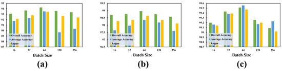 (2) Batch Size: In Figure 8, the impact of batch size on OA of the three datasets is presented. The batch size was chosen from a set of candidates {}. Clearly, the classification metrics we have presented achieve the best results when the batch size is set to 64.
