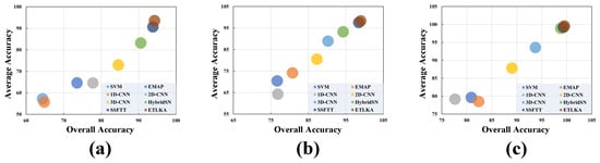 where is truly positive, is truly negative, is false positive, is false negative, C is the number of classes, and and are the true positives and false positives for class i, respectively. Additionally, is observed accuracy and is random accuracy. In classification problems, can be calculated through OA, while can be calculated through the marginal probabilities of the classes. The best results for each metric in the tables are highlighted in bold. It is evident that our proposed ETLKA model outperforms the seven compared methods. Taking the India Pines dataset as an example, our proposed approach demonstrated superior classification performance for categories ‘Alfalfa’, ‘Corn-min-till’, ‘Corn’, ‘Grass-tree’, ‘Grass-pasture-mowed’, ‘Oats’, ‘Soybean-clean’, and ‘woods’. This owes to the innovative feature extraction method, efficient attention strategy, and the incorporation of the Transformer architecture in our proposed framework. In Figure 9, we visualized the performance comparison of different methods on different datasets. It is evident from the visualization that the proposed ETLKA model exhibits the best performance.