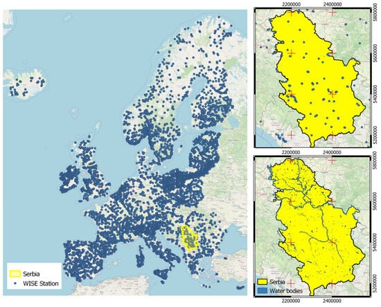 Study area. (Left): location of the Water Information System of Europe (WISE) monitoring stations in Europe. (Upper Right): Location of monitoring stations in the Republic of Serbia. (Lower Right): Location of main water bodies in Serbia.
