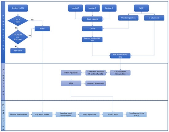 Prediction: The trained ANN models were used to monitor the WQP concentration based on Landsat 8 Level 2A images for the year 2020 in the study area. Before making the prediction, the images needed to be masked using a water mask (created in the preprocessing phase) in order to ensure that all the pixels represent the water and do not contain surrounding classes. After the prediction of the WQP concentration water quality was classified into classes based on values presented in Table 3. Those values were defined to be in line with those as defined by the legal documents in the field for the Republic of Serbia [57,58,59].