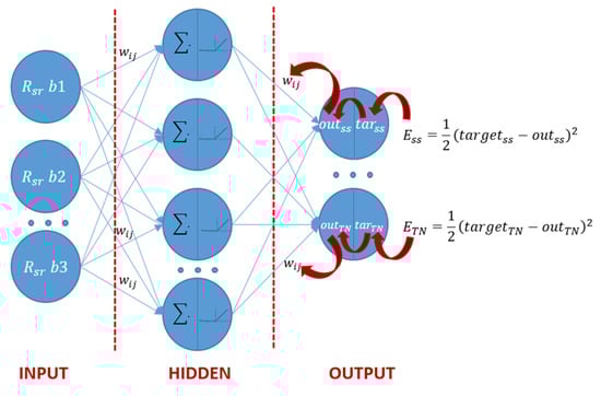 Processing: The relationship between the WQP concentration and surface reflectance was modeled by using ANN. ANNs are pattern-recognition algorithms that consist of an interconnected group of artificial neurons, and they process information using a connection approach to computation [53] In this study, a fully connected back-propagation neural network was applied. The network had three layers: input, hidden, and output (Figure 3). The input layer represents predictor or independent variables (in this case radiance measurement of different wavelengths). Hidden layers contain a varying number of neurons. The number of nodes in the hidden layer depends on the complexity of the approximated function and sample numbers. If the network is too small, the self-learning ability and precision of the network will decrease, causing under-fitting. Meanwhile, if the network is too large, training time will increase, and the generalization capability of the network will decrease, producing over-fitting [54]. There is no theoretical formula that can be used for the selection of optimum NN architecture. The architecture was fixed by using a trial-and-error approach. The output values of the hidden layer were the input values of the output layer, which also performs the summation and activation functions. The output of this layer was the target of water quality parameters. To derive the correct output, the network learned by training on the subsets of in-situ data. In the back-propagated network, the outputs were then compared with actual values from the training data set, the error was calculated, and the results were transferred to the output layer. As the data passed through the network many times, weights were adjusted and errors were reduced (Figure 3).