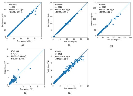 According to the results, the highest accuracy (R2, NRMSE [%]) was obtained for chl-a and TSS (Table 5). This is expected since those are optically active water parameters. For chl-a, the accuracy attained in this paper (R2: 0.99, NRMSE: 0.79%) was higher than the ones reported in previous studies. Barraza-Moraga et al. [62] achieved an NRMSE of 3.6% (R2: 0.97, RMSE: 2.58) using Sentinel 2 images to develop an MLE model for chl-a monitoring, while [63] used UAV images and MLR resulting in a R2 of 0.91 and RMSE of 0.07. Along the same lines, Ref. [64] used UAV images to build a CNN model and obtained an R2 of 0.79 (RMSE: 8.76), while [65] used Sentinel 2 images and Ada boost regression resulting in a R2 of 0.90 (RMSE: 1.48). Hafeez et al. [20] used ANN achieving an NRMSE of 5.1% (R2: 0.87, RMSE: 1.4) while [66] reached an R2 of 0.88 using CNN and Sentinel 2 and Geo-Fan 2.