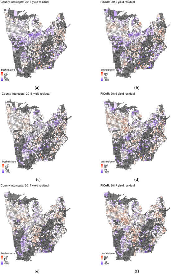 Generally, the remaining spatial patterns in the residuals (observed–predicted crop yield) are similar across all models for all held-out years (Figure 5a–h). For 2018 (Figure 5g,h), the county intercepts approach overpredicts the yield a bit more in parts of Iowa. The PICAR model overpredicts the yield a bit more in a few other counties and years. Again, these differences are not large relative to the scale of the corn yields. The largest overestimates of yields from both models tend to occur in Georgia. We hypothesize that this is due to the fit of the quadratic time trend by state.