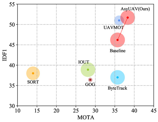 As demonstrated in Table 2, the AsyUAV attains the highest performance on various MOT metrics, with a score of 38.3% on MOTA and 51.7% on IDF1.