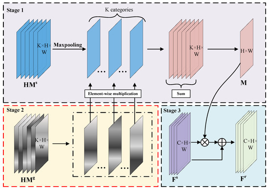 As shown in the second stage of Figure 4, we utilize the pseudo-Gaussian heatmap to limit the feature representation areas for each layer of the detection heatmap. This way can effectively highlight the region of interest and mitigate background interference. We perform element-wise multiplication and summation along the channel dimension to create a unified aggregated feature map, denoted as M, yielding