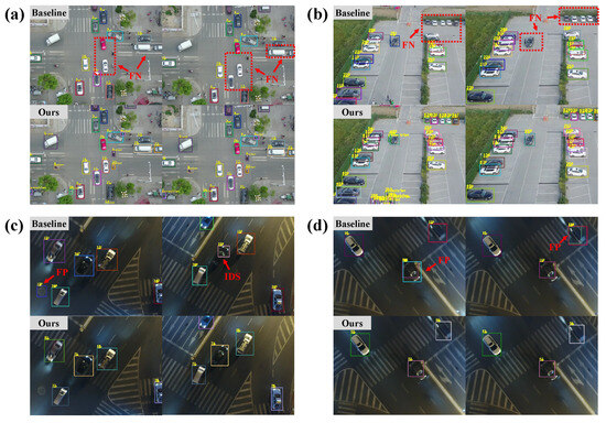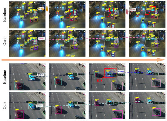 When the UAV hovers over the intersection, the primary challenge is the temporary occlusion caused by the traffic signals that obstruct all passing vehicles. As shown in Figure 6, both during the daylight and at night, due to the occlusion of traffic signals, the baseline appears to ID switches and false negatives. This observation demonstrates that the baseline is vulnerable to partial occlusion. However, benefiting from the synergy of the GCAE and EFA modules, the AsyUAV can effectively achieve trajectory continuity. The visualization results offer excellent detection performance and robust identity embedding of our tracker in UAV videos.