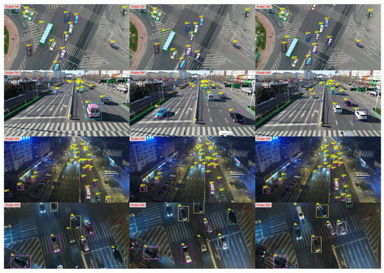 To show the effectiveness of our method more intuitively, we present visual tracking results of AsyUAV on the VisDrone2019 dataset (Figure 7) as well as the UAVDT (Figure 8) dataset. The AsyUAV performs remarkably in dynamic UAV environments, accurately tracking small and moving targets under varying lighting conditions. The obtained visualisation results exhibit that AsyUAV executes the MOT task proficiently, even when encountering intricate and varied UAV videos.