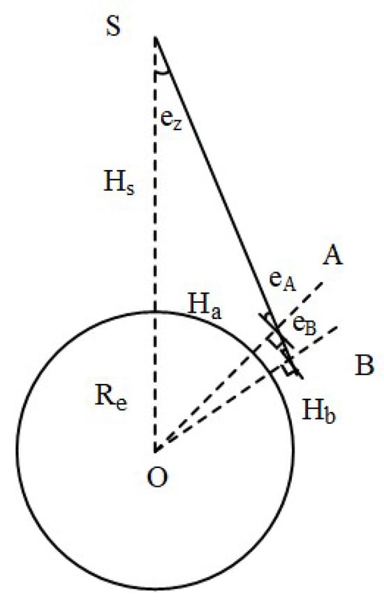 where indicates and are the elevation angle and altitude of station A, respectively; represents the nadir angle of station A; represents the altitude of station A, indicates the earth’s radius and represents the altitude of satellite S.
