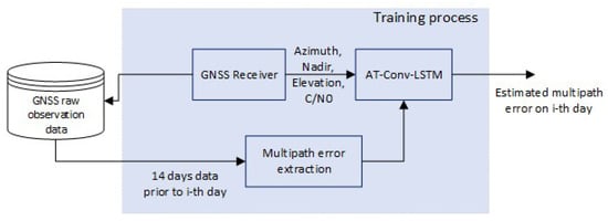 In this study, we propose a multipath error modeling method based on AT-Conv-LSTM network. The algorithm flowchart is shown in Figure 2: (1) Raw BDS-3 observations collected from GNSS stations are stored in the database, and then undergo a post-processing procedure to proceed multipath extraction operations to be used as training data. (2) A sliding window size is set, and the AT-Conv-LSTM network is updated by incorporating the earlier model and incoming multipath errors, and the multipath errors are estimated in the current epoch. (3) The code multipath is corrected at the corresponding epoch based on the AT-Conv-LSTM network to mitigate the multipath.