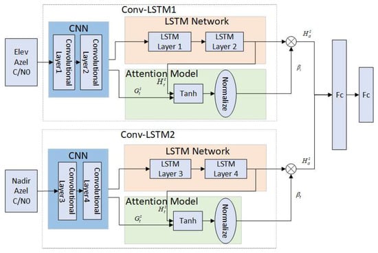 The core component of the proposed network is the Conv-LSTM module, encompassing two convolutional layers and two LSTM layers. The C/N0, nadir angle and azimuth angle of the mth satellite on the epoch can be represented as . Subsequently, we aggregate the historical angles from its neighboring locations (total n epochs) as follows: