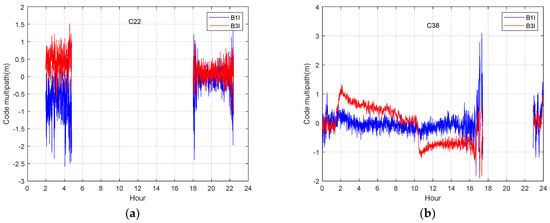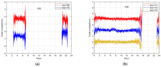 Comparison of the multipath errors for C22 (a) and C38 (b). The vertical 2 m offset was applied to the code multipath sequences for illustration purposes.