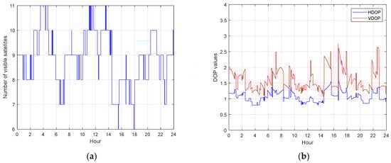 BDS-3 visible satellites on DOY 176. (a) number of BDS-3 visible satellites (b) HDOP and VDOP of BDS-3 satellites.