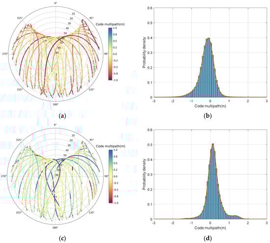 BDS-3 multipath sky map and histogram of code multipath. (a) B1I multipath sky map; (b) histogram of B1I code multipath; (c) B3I multipath sky map; (d) histogram of B3I code multipath. The red line in right panels is the envelope of the code multipath distribution.