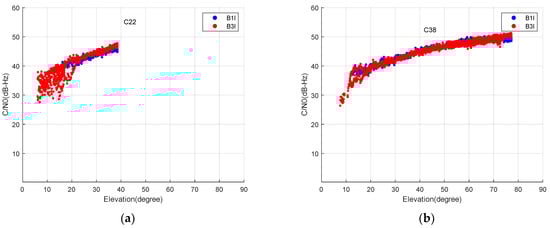 C/N0 of B1I and B3I of MEO satellites (a) and IGSO (b) with respect to elevation angle.