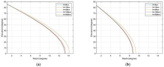 Figure 9 demonstrates that the variation of the elevation angle of MEO and GEO/IGSO satellites to the receivers at different elevations with the nadir angle. Along with the growth in elevation angle, the range of the observable nadir angle increases. The elevation angle changes with the station altitude for the same nadir angle, and as the nadir angle increases, the difference in elevation angle at different latitudes becomes more noticeable. For example, if the nadir is 13.21° (H = 0 km, elevation = 0°), the elevation angles are 3.21°, 7.15°, 10.08° and 21.99° when the station is located at 10 km, 50 km, 100 km and 500 km, respectively. In conclusion, extra errors will be introduced into multipath error correction using elevation angle as the feature, according to previous studies.