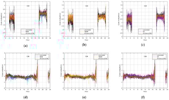 The time series of the C22 MEO satellite uncorrected code multipath and the AT-Conv-LSTM-estimated code multipath compared with MHM (a), T-MHM (b) and SF (c). The time series of the C38 IGSO satellite uncorrected code multipath and AT-Conv-LSTM-estimated code multipath compared with MHM (d), T-MHM (e) and SF (f).