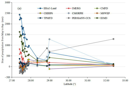 Bias of precipitation products vis a vis the Tibetan Plateau in the warm season in 2018 from May to September compared to (a) west–east cross-sectional rainfall observations of 19 gauges, (b) south–north cross-sectional rainfall observations of 20 gauges, and (c) all cross-sectional rainfall observations.
