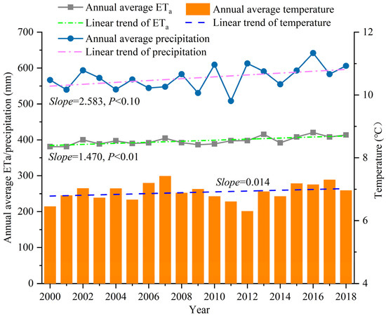 The linear trends for annual ETa, temperature, and precipitation in China, 2000–2018.