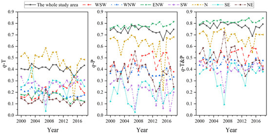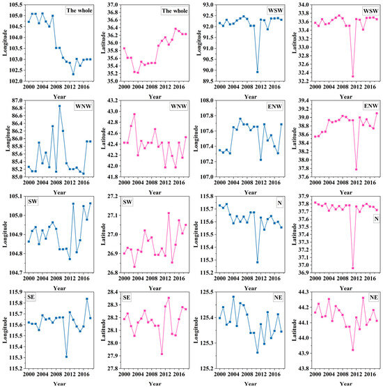 The coordinates of the center of gravity of ETa were calculated for the study area and the seven geographic sub-regions by using the center of gravity migration model. Accordingly, the change in each center of gravity from 2000 to 2018 was plotted, and the results are shown in Figure 4. The center of gravity of ETa generally migrated to the northwest throughout the study area. This was closely associated with the rise in precipitation in the Northwest since the 21st century. There were differences in the transformation of the center of gravity of ETa within each climate subregion. The center of gravity of ETa in WSW, N, SE, and NE showed a migration to the southwest in 2011. The same happened in ENW in 2012. The center of gravity of ETa in the SW suddenly moved to the northeast in 2013. The reason was that the severe drought that occurred in SW in 2013 was concentrated in its southwestern region, which greatly reduced ETa in SW and shifted the center of gravity to the northeast.