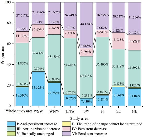 Following Wu et al. [47], the future trends for ETa can be obtained by overlaying the spatial change trends with the Hurst index classified as shown in Table 3. Figure 3 and Figure 6a were applied to the spatial superposition analysis to form the distribution of future tendency for ETa (Figure 6b). Future trends of the ETa for 0.671% of the study area were undetermined. From 2000 to 2018, the ETa in these regions fluctuated greatly, and the complex pattern of change made the trends for ETa in these regions difficult to predict. The percentages of areas showing an anti-persistent increase and anti-persistent decrease in the WSW region were close (33.323% and 32.402%, respectively). The type with the highest proportion in the SW area had a persistent increase (44.174%), while in other regions, this type had an anti-persistent decrease (Figure 7). The results above demonstrated that, in the future, there will be more areas with decreasing trends (52.981%) than those with increasing trends. Areas that showed a continuous decreasing trend were predominantly centralized in Taiwan Province, the central-eastern area of WSW, the mountain range of northern NE, and the hilly area of SE.