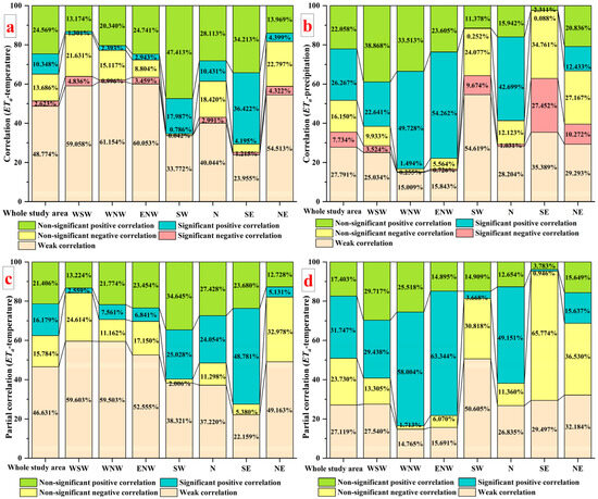 Figure 8 shows the significance of the correlation and partial correlation between ETa and temperature (a) and precipitation (b). The percentages of the places where ETa and temperature were positively and negatively correlated were 34.917% and 16.309%, respectively, while ETa and precipitation were positively and negatively correlated for 48.325% and 23.884% of places, respectively. The results showed that ETa correlated positively with both meteorological factors in a spatially wider area, and the precipitation correlated more positively than temperature with ETa. The area with a positive correlation between ETa and temperature was 10.348%, primarily concentrated in the central region. This correlation type occupied the largest area (36.422%) in the SE region. In the N region and NE region, the large continuous distribution of ETa showed a highly significant positive correlation with precipitation, and in the ENW region, the area of significant positive correlation even exceeded half of the entire space, which was related to the low precipitation in these regions. In addition, the areas where ETa demonstrated the same correlation with temperature and precipitation were largely situated in the southwestern area of ENW, the southeastern part of SW, and other areas. This phenomenon further suggested that precipitation and temperature were the primary meteorological elements that influenced regional ETa and led to the divergence of spatial and temporal patterns, while temperature and precipitation played a common role in ETa in these regions.