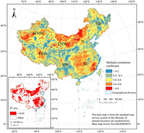Multiple correlation coefficient and significance of ETa with temperature and precipitation in China, 2000–2018.