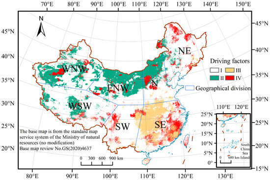 Driving Factor Zoning Map, 2000–2018 (China). The Roman numerals have the following meanings: I—other-factors-driven, II—precipitation-driven, III—temperature-driven, and IV—Joint precipitation- and temperature-driven.