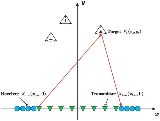 In order to facilitate the two-dimensional imaging of MIMO radar, the transmitting and receiving arrays of MIMO radar are arranged on the x-axis according to the schematic diagram in Figure 1. The n-th receiving element is denoted as , which is illustrated in the figure by a blue circular icon, and is the coordinate position of the receiving element in the x-axis. Similarly, the m-th transmitting element is denoted as , which is illustrated in the figure by a green triangular icon, and is the coordinate position of the transmitting element in the x-axis. The q-th target is denoted as and is illustrated in the figure with a triangular pyramid icon, is the position of the target in the 2D plane. A signal transmitting and receiving path is shown with a red arrow line in the figure. Similarly, the green triangular icon in the figure represents the receiving array element, denoted as xrn.The position coordinates of the transmitting and receiving elements can be represented as