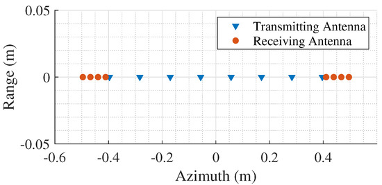 Figure 2 shows the schematic diagram of the designed MIMO array distribution. The transmitting array element spacing is designed to be m, while the receiving array elements spacing is m. The composed MIMO radar aperture is m. According to previous research work [5], this array-design method can bring about great reduction in the total number of antenna elements and improve aperture efficiency while maintaining the aperture size. MIMO radars utilizing such arrays have the advantages of high gain, low sidelobes and good imaging and focusing performance [5].