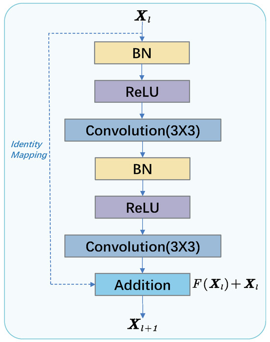 Particularly, the residual unit designed in this work chooses an identity mapping as suggested in [39]. The identity mapping constructs a direct path for propagating information through the network, which makes the training of our U-Net model in general become easier. So the residual unit can be expressed by Equation (13).