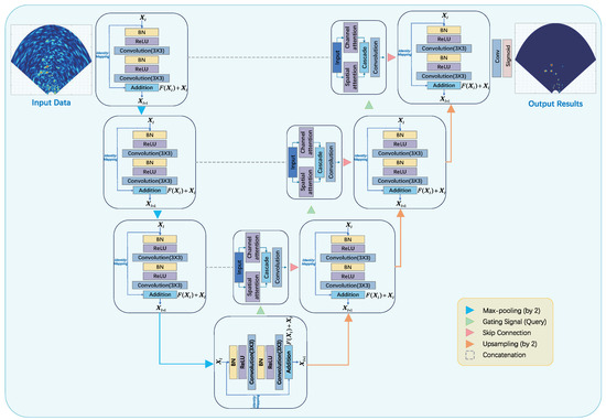 The MIMO radar TCC-BP imaging algorithm can reduce the computation greatly compared to the traditional BP algorithm, but it also results in a distance correction error that affects the imaging quality. In this section, the proposed RAU-Net-based MIMO radar imaging method will be introduced to eliminate the spatial variation and sidelobe interference and remove the background noise.