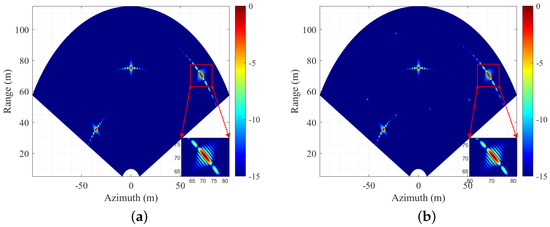 As showed in Figure 1, an eight-transmitter, eight-receiver MIMO radar is adopted in this work to for multi-target imaging. The m-th transmitting array element is , in which is the x-axis coordinate, and the n-th receiving array element is , in which is the x-axis coordinate. The q-th target in the region of interest is expressed as . The echo data expression of the MIMO radar is a function of the position variable and . For two-dimensional imaging, the function form of the array element n and time t need to be compressed through matched filtering in range and azimuth direction. Both the signal envelope and carrier frequency phase terms are related to the variable and .