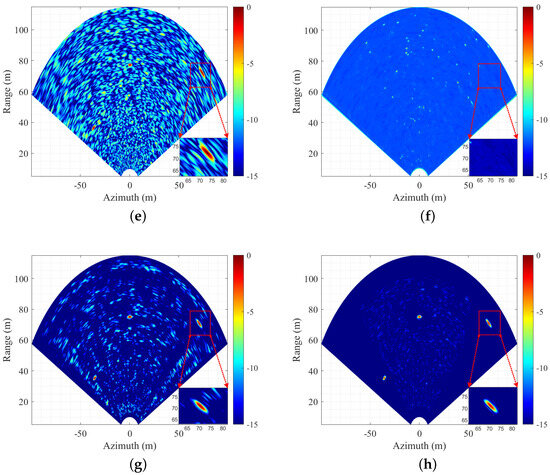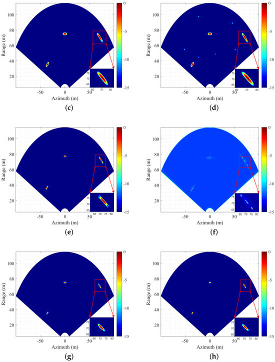 Experiment 2: Imaging results of simulated targets under −20 dB SNR. (a) BP algorithm without Hanning window; (b) TCC-BP algorithm without Hanning window; (c) BP algorithm with Hanning window; (d) TCC-BP algorithm with Hanning window; (e) SVA; (f) GAN; (g) U-Net; (h) ours.