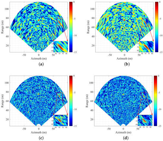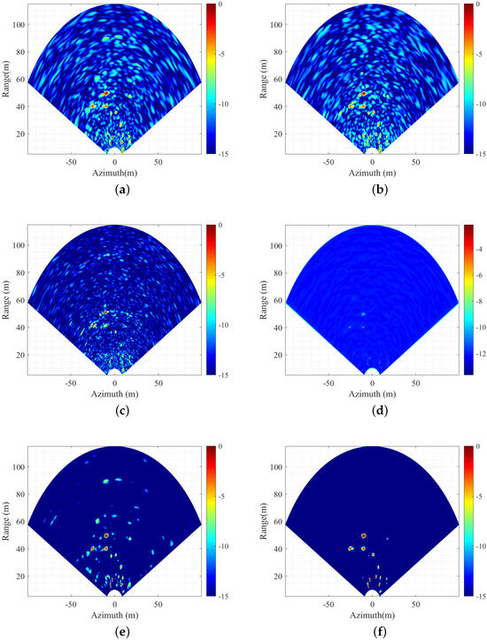 - Although the SVA-based method in Figure 9c can significantly reduce the sidelobes and solve the resolution spatial-variant problem to a certain extent, there is still much obvious background noise in the imaging result and a large number of small targets are mixed with the noise, making it difficult to realize effective target recognition;
