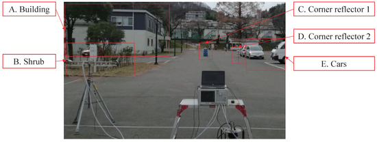 In this section, three experiments with real-world measured data are conducted to illustrate the performance and effectiveness of the proposed RAU-Net-based imaging method in practice. Figure 8 shows the MIMO radar system and the experiment scene, where the MIMO array is on the bottom left side and the vector network analyzer (VNA)-based data acquisition equipment is on the bottom right side. Five-type targets in the scene are labeled in Figure 8, which are Building (A), Shrub (B), Trihedral corner reflector (CR)-1 (C), CR-2 (D) and Cars (E). The MIMO array has eight transmitters and eight receivers, which can approximate a virtual aperture of about 1m, giving an azimuth resolution of about 0.03 rad. The VNA is used to generate a stepped frequency continuous wave signal with 481 frequency steps, 5 GHz central frequency, and 150 MHz bandwidth, giving a range resolution of 1 m. Detailed MIMO radar parameters are shown in Table 2.