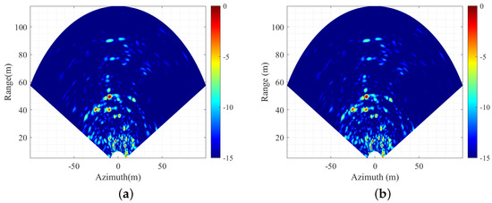 - Combined with the MIMO radar imaging scenario, an improved loss function based on the nuclear norm is proposed, which enhances the network’s ability of focusing for MIMO radar point-spread function and denoising in MIMO radar images;