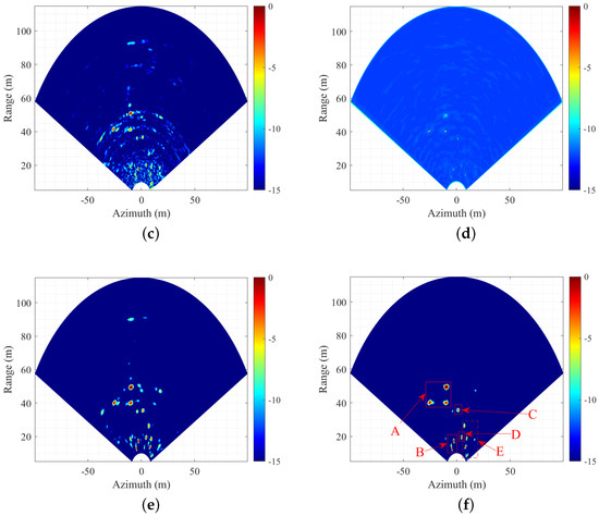 Finally, in Experiment 5, with the same data used in Experiment 4, we conducted ablation experiments on the channel attention block, spatial attention block and residual dense connection block to verify the effect of each proposed module. Figure 11 shows the imaging results and Table 7 shows the corresponding performance evaluation indexes. From the results in Figure 11b,c we can find that the U-Net structure has a significant effect on removing background noise and extracting effective information, while the RD module has a significant contribution to prevent the model from overfitting, i.e., preventing the model from focusing too much energy on background noise. From the result in Figure 11d and the corresponding evaluation indexes, we can corroborate the role of the SA module: without the SA module, although the IE index decreases, the focusing of targets will be greatly reduced, and some weak targets cannot be effectively imaged. Additionally, although the SA block and the CA block both have some effects in improving target focusing and reducing background noise, the role of the SA block is more obvious than the CA block in Figure 11e. In summary, the proposed model and its corresponding modules all contribute to the improvement of imaging performance.