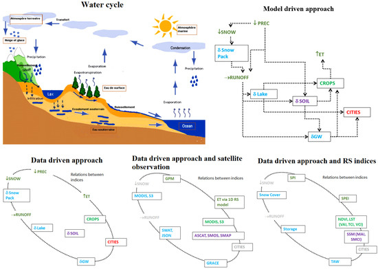 From the natural water cycle to a data-driven approach to drought. These pictures must be read from top to bottom and left to right. The model-driven approach focuses on the most important fluxes of water to the system. In the continental system, the incoming fluxes are liquid precipitations (↓PREC) and solid precipitations (↓SNOW). Outgoing flux is mainly due to evapotranspiration (↑ET). Lateral fluxes are only represented with runoff (→RUNOFF). Groundwater fluxes are not represented here. The main storages are shown for the snowpack (δSNOWPACK), the storages in lakes (δLAKE), groundwater (δGW), and soil water storage (δSOIL). The complex systems of vegetation and urban areas are shown as state values of CROPS and CITIES. The black arrows show the main relations between fluxes, storages, and complex systems. The third picture shows a representation of the data-driven approach, in which the mechanistic inter-relations are lost and replaced by statistical relations between indices. The fourth picture shows some of the available sources of remote sensing (RS) platforms that can provide observations. The fifth picture shows some of the main indices provided by RS. (https://commons.wikimedia.org/wiki/File:F3_hydrological_cycle.png, accessed on 6 April 2023).
