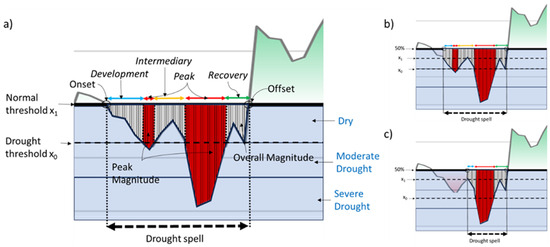 A graphical explanation of thresholds, categories (blue letters), drought magnitudes (white, and red areas), stages (italic letters) in a drought spell, and wet periods (green areas). (a) shows an example with x1 = 50%. (b) shows that the duration of the drought spell is reduced when x1 decreases. (c) shows the impact of decreasing x0.